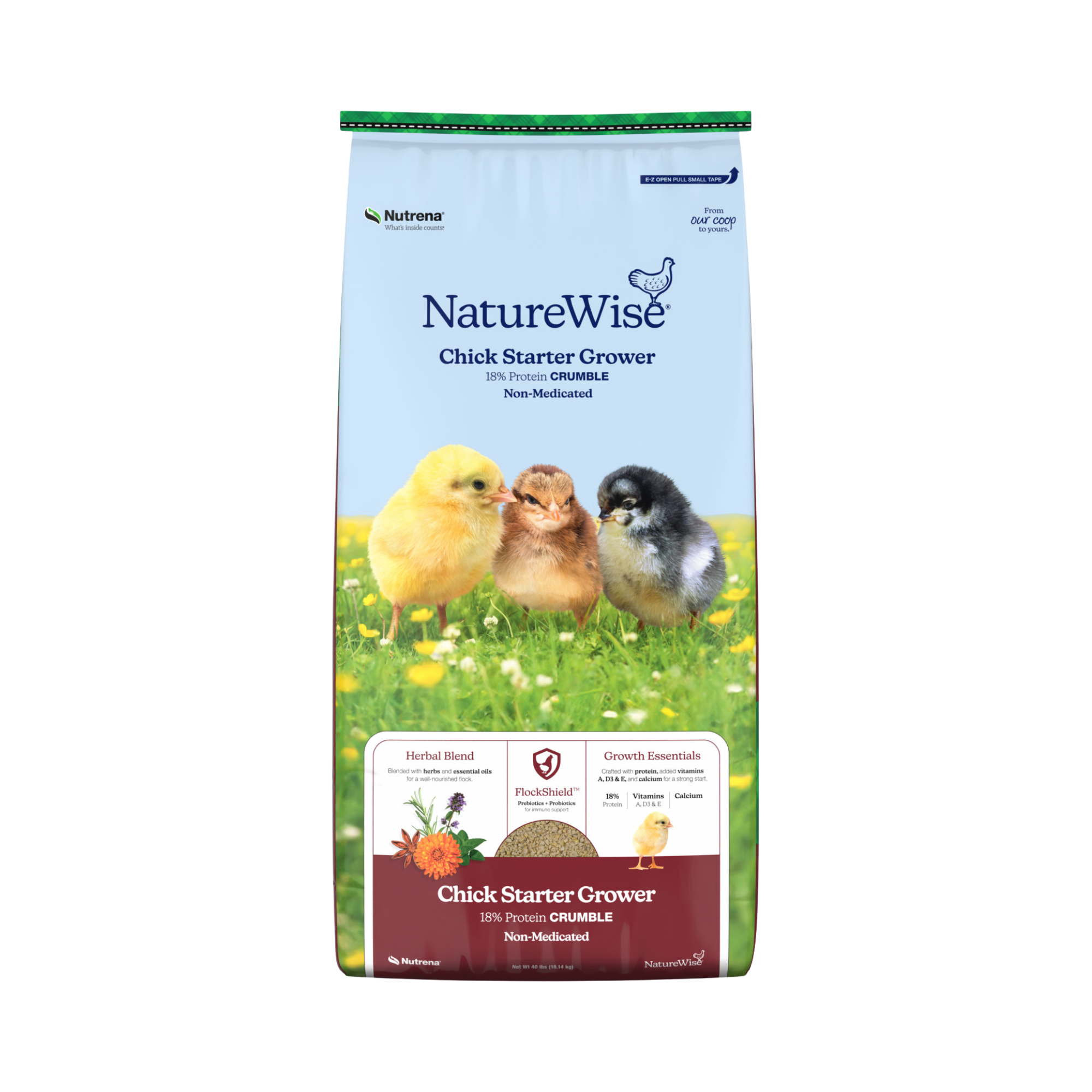 Nutrena® NatureWise® Chick Starter Grower 18% Protein Crumble Non-Medicated chicken feed is crafted for the backyard chicks you call family. With 18% protein and essential vitamins A, D₃, E, and calcium, it supports healthy growth and development from hatch through 16 weeks. The crumble form is easy for small beaks and reduces waste. Fortified with our Herbal Blend and FlockShield®, it promotes strong immunity and digestion for a healthy start.